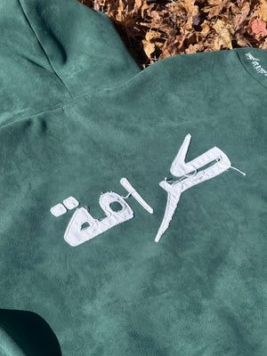The ʿIzzah Hoodie stands as a symbol of unshakable self-respect. Every stitch carries meaning — from the Arabic embroidery “الكرامة لا تُشترى” (Dignity is not for sale) along the sleeve, to the bold “كرامة” (Karamah – Dignity) emblazoned across the back.